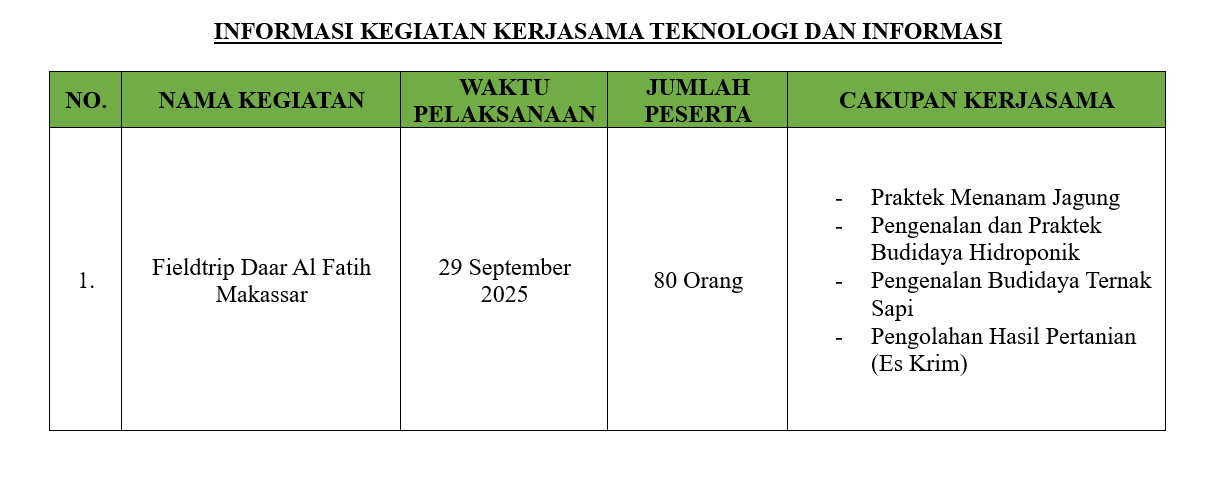 Informasi Keggiatan Kerjasama Tanggal 29 September 2025 posted by Haryuti Abdi 191 29/09/2025 09:00:00 Informasi Kegiatan Kerjasama Teknologi dan Informasi di BBPP Batangkaluku