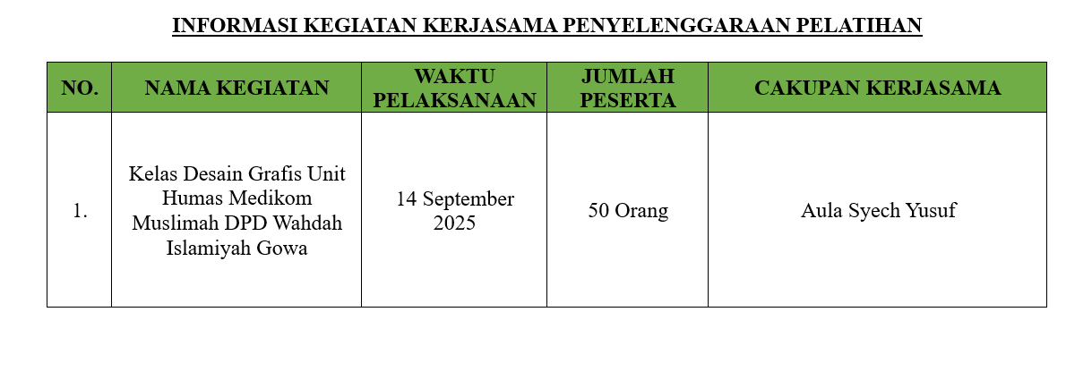 Informasi Kegiatan Kerjasama Tanggal 14 September 2025 posted by Haryuti Abdi 285 14/09/2025 08:00:00 Informasi Kegiatan Kerjasama Penyelenggaraan Pelatihan di BBPP Batangkaluku