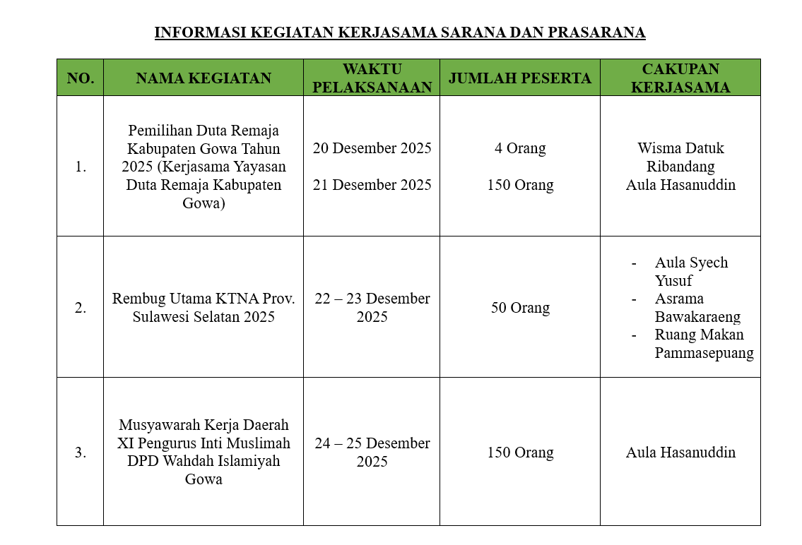 Informasi Kegiatan Kerjasama Tanggal 20 - 25 Desember 2025 posted by Haryuti Abdi 8 20/12/2025 08:00:00 Informasi Kegiatan Kerjasama Sarana dan Prasarana di BBPP Batangkaluku